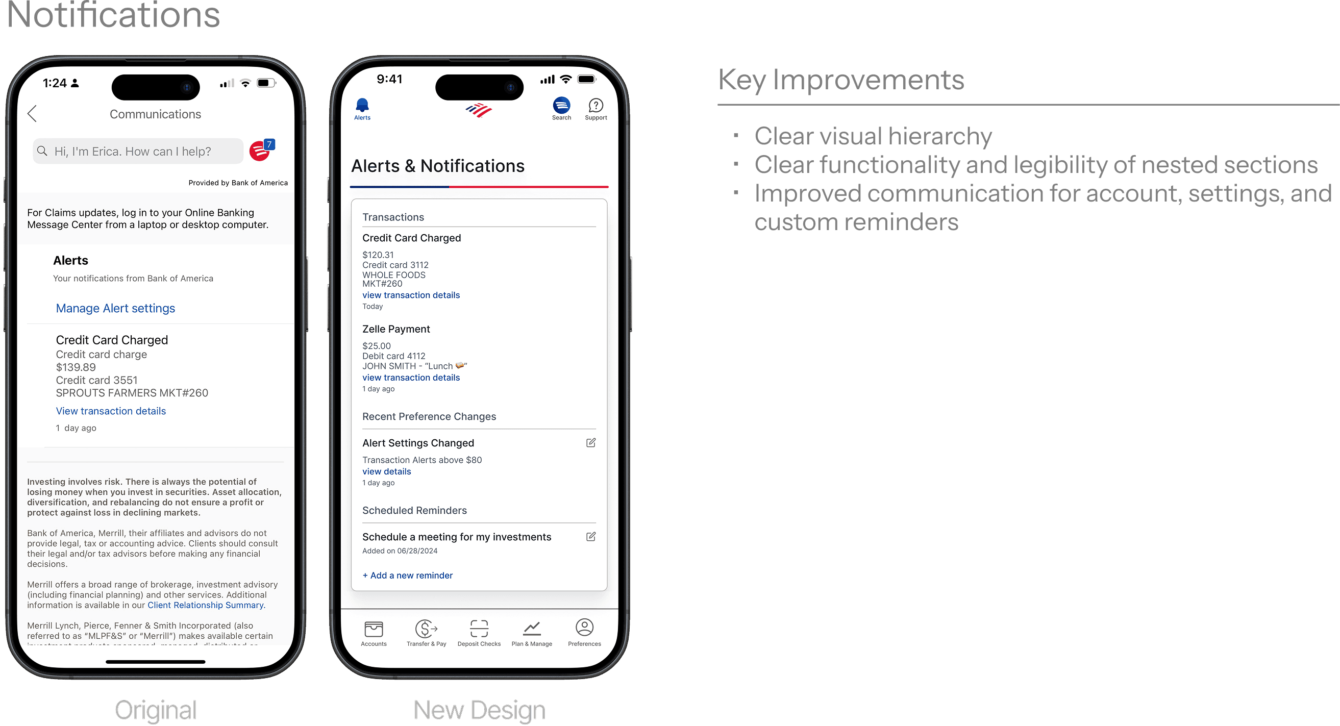Redesign how notifications are implemented, focusing on information architecture for legibility, and clear and relevant CTAs.